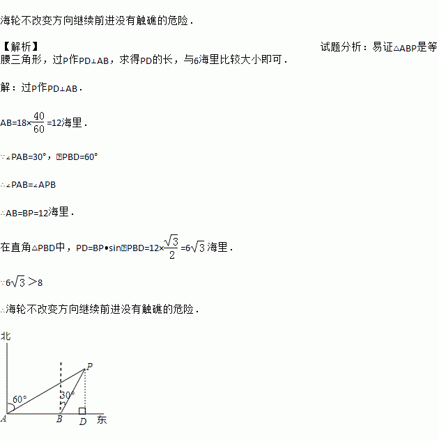 (2014•南通)如图,海中有一灯塔P,它的周围8海里内有暗礁.海轮以18海里/时的速度由西向东航行,在A处测得灯塔P在北偏东60°方向上;航行40分钟到达B处,测得灯塔P在北偏东30°方向上;如果海轮不改变航线继续向东航行,有没有触礁的危险?