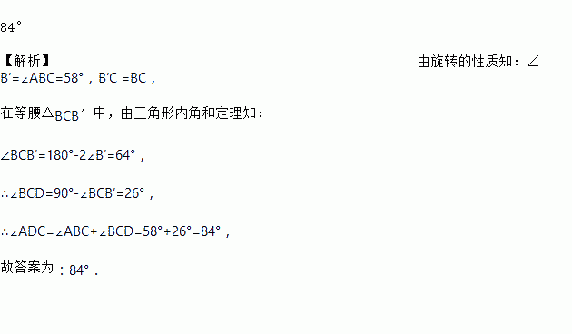 如图,在Rt△ABC中,∠ACB=90°,∠ABC=58°,将Rt△ABC绕点C旋转到Rt△A'B'C',使点B恰好落在A'B'上,A'C交AB于点D,则∠ADC的度数为________.