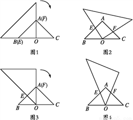 如图所示,在△ABC中,AB=AC=2,BC=2,∠A=90°.取一块含45°角的直角三角尺,将直角顶点放在斜边BC的中点O处,一条直角边过点A(如图1).三角尺绕点O顺时针方向旋转,使90°角的两边与Rt△ABC的两边AB,AC分别相交于点E,F(如图2).设BE=x,CF=y.