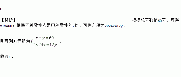 玩具车间每天能生产甲种玩具零件24个或乙种玩具零件12个,若甲种玩具零件一个与乙种玩具零件2个能组成一个完整的玩具,怎样安排生产才能在60天内组装出最多的玩具设生产甲种玩具零件x天,乙种玩具零件y天,则有( )
