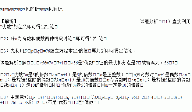 (3)把“优数”p的2倍与“优数”q的3倍的差记为D(p,q),例如:20=4×5,6=2×3,则D(20,6)=2×20﹣3×6=22.若“优数”p的最优拆分点为t+4,“优数”q的最优拆分点为t,当D(p,q)=76时,求t的值并判断它是否为“优数”.