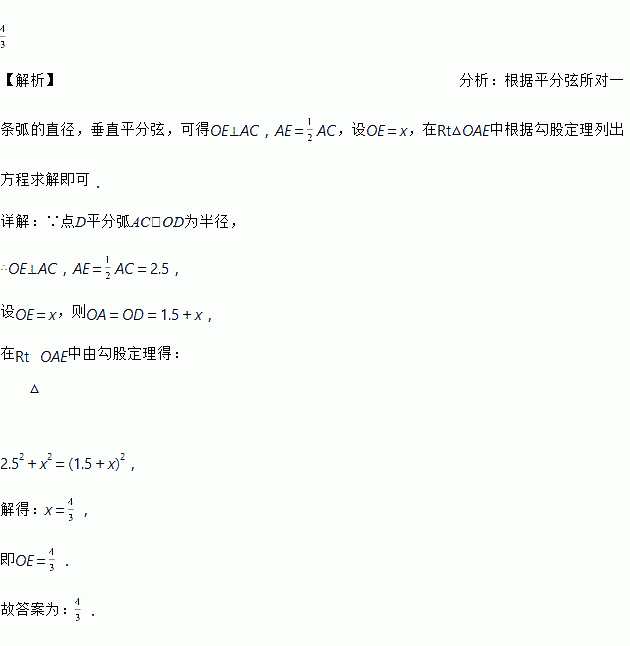如图,AB是⊙O的直径,点D平分弧AC,AC=5,DE=1.5,则OE=_____.
