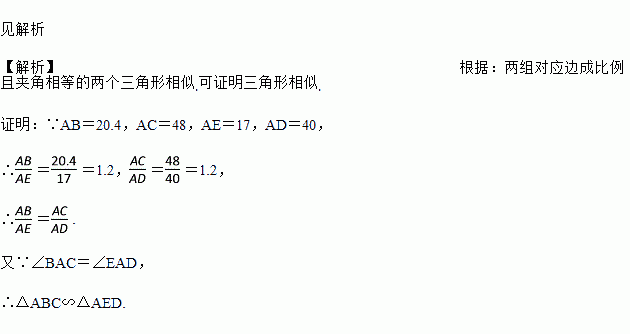 如图,已知∠BAC=∠EAD,AB=20.4,AC=48,AE=17,AD=40.