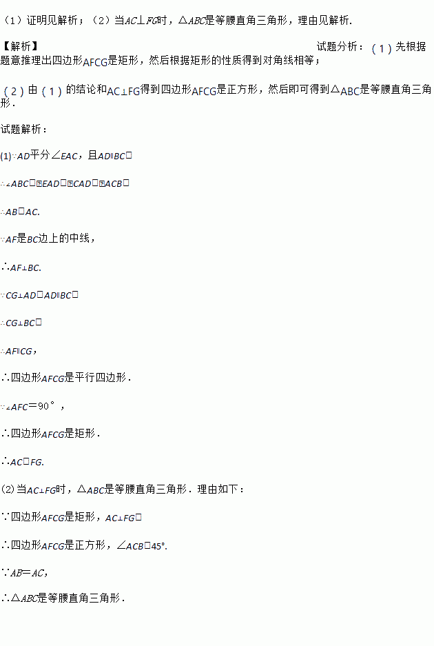 如图,∠CAE是△ABC的外角,AD平分∠EAC,且AD∥BC.过点C作CG⊥AD,垂足为G,AF是BC边上的中线,连接FG.