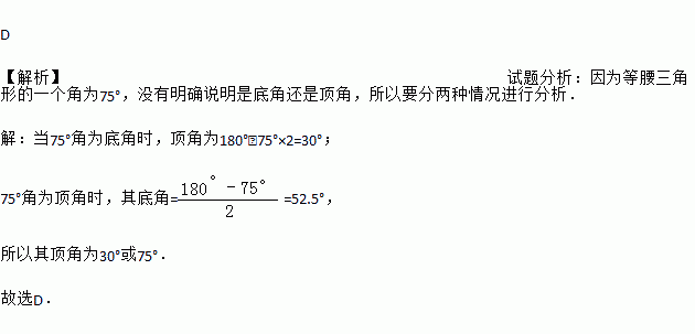A. 30° B. 75° C. 105° D. 30°或75°