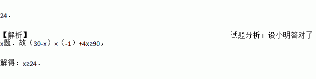 一次普法知识竞赛共有30道题,规定答对一道题得4分,答错或不答,一道题得-1分,在这次竞赛中,小明获得优秀(90或90分以上),则小明至少答对了 道题.