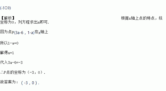 已知点P(3a-6,1-a)在x轴上,则点P的坐标为____.