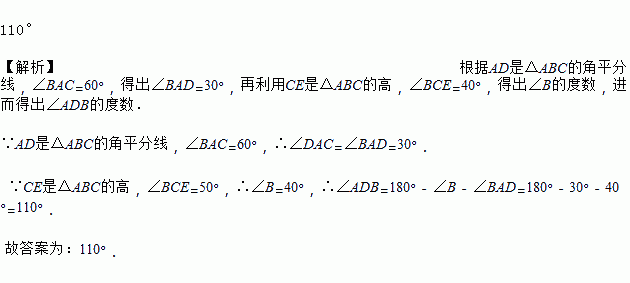 如图,已知AD是△ABC的角平分线,CE是△ABC的高,∠BAC=600,∠BCE=500,则∠ADB的度数是 _________.