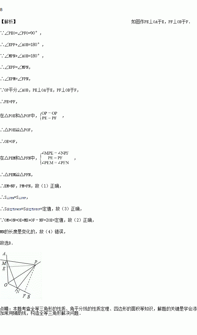 如图,点P为定角∠AOB的平分线上的一个定点,且∠MPN与∠AOB互补,若∠MPN在绕点P旋转的过程中,其两边分别与OA、OB相交于M、N两点,则以下结论:(1)PM=PN恒成立;(2)OM+ON的值不变;(3)四边形PMON的面积不变;(4)MN的长不变,其中正确的个数为( )