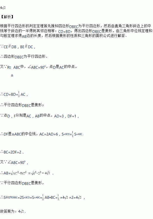 如图,Rt△ABC中,∠ABC=90°,点D,F分别是AC,AB的中点,CE∥DB,BE∥DC,AD=3,DF=1,四边形DBEC面积是_____