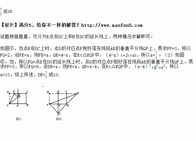 如图,在矩形ABCD中,AD=5,AB=8,点E为射线DC上一个动点,把△ADE沿直线AE折叠,当点D的对应点F刚好落在线段AB的垂直平分线上时,则DE的长为_____.