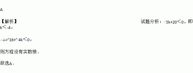 A 【解析】试题分析:∵5k+20<0,即k<-4, ∴△="16+" 4k<0, 则方程没有实数根. 故选A.