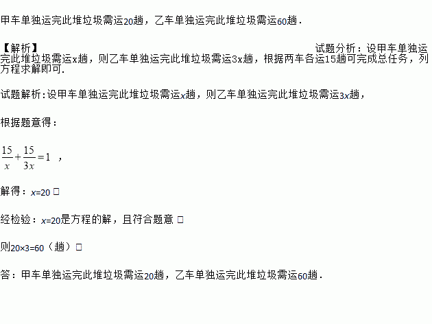 甲车单独运完此堆垃圾需运20趟,乙车单独运完此堆垃圾需运60趟. 【解析】试题分析:设甲车单独运完此堆垃圾需运x趟,则乙车单独运完此堆垃圾需运3x趟,根据两车各运15趟可完成总任务,列方程求解即可. 试题解析:设甲车单独运完此堆垃圾需运x趟,则乙车单独运完此堆垃圾需运3x趟, 根据题意得: , 解得:x=20 , 经检验:x=20是方程的解,且符合题意 , ...