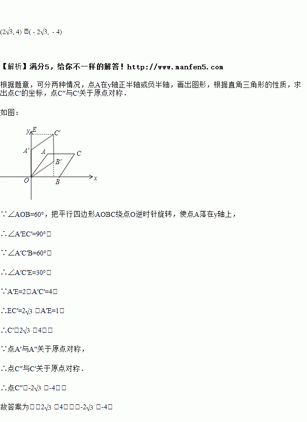 平行四边形在平面直角坐标系中的位置如图所示,,,AC=4,把平行四边形绕点逆时针方向旋转,使点落在轴上,则旋转后点的对应点的坐标为________.