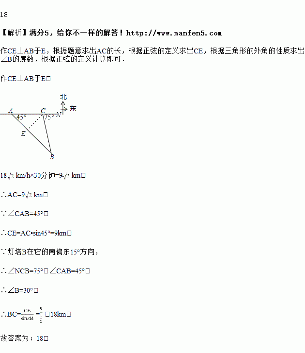 km/h的速度在海面上沿正东方向航行,当行驶至A处时,发现它的东南方向有一灯塔B,货轮继续向东航行30分钟后到达C处,发现灯塔B在它的南偏东15°方向,则此时货轮与灯塔B的距离是________km.