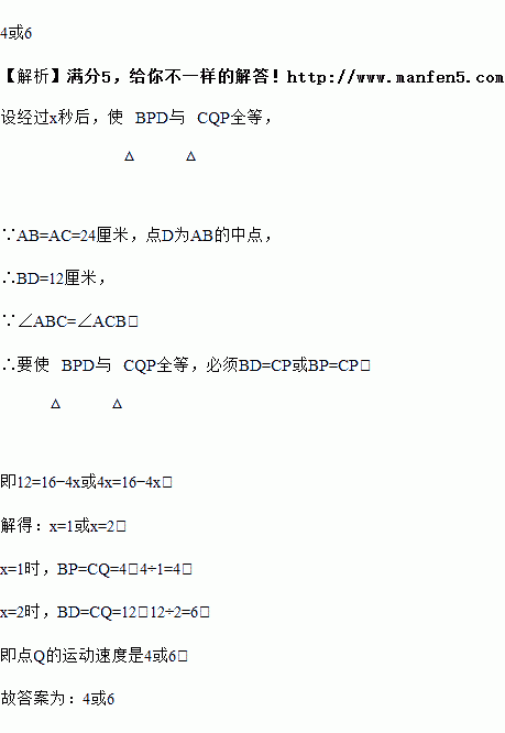 如图,在△ABC中,AB=AC=24厘米,BC=16厘米,点D为AB的中点,点P在线段BC上以4厘米/秒的速度由B点向C点运动,同时,点Q在线段CA上由C点向A点运动.当点Q的运动速度为_____厘米/秒时,能够在某一时刻使△BPD与△CQP全等.