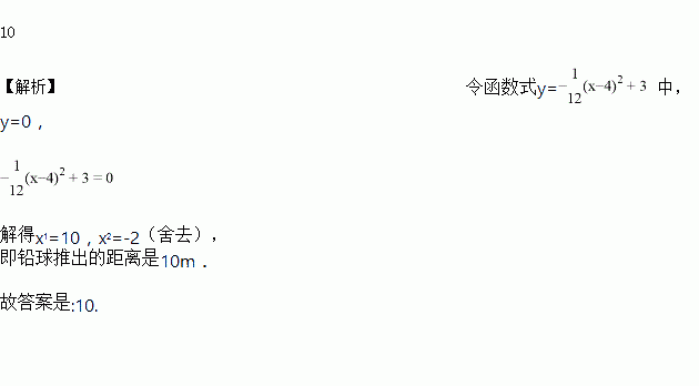 教练对小明推铅球的录像进行技术分析,发现铅球行进高度y(m)关于水平距离x(m)的函数表达式为y=- (x-4)2+3(如图所示),由此可知铅球推出的距离是_____m.