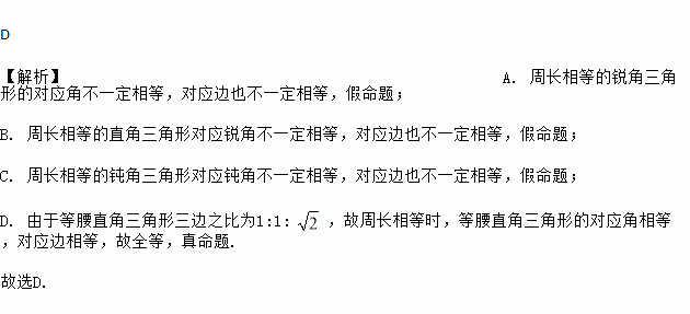 D ¡¾½âÎö¡¿A. Öܳ¤ÏàµÈµÄÈñ½ÇÈý½ÇÐεĶÔÓ¦½Ç²»Ò»¶¨ÏàµÈ£¬¶ÔÓ¦±ßÒ²²»Ò»¶¨ÏàµÈ£¬¼ÙÃüÌ⣻ B. Öܳ¤ÏàµÈµÄÖ±½ÇÈý½ÇÐζÔÓ¦Èñ½Ç²»Ò»¶¨ÏàµÈ£¬¶ÔÓ¦±ßÒ²²»Ò»¶¨ÏàµÈ£¬¼ÙÃüÌ⣻ C. Öܳ¤ÏàµÈµÄ¶Û½ÇÈý½ÇÐζÔÓ¦¶Û½Ç²»Ò»¶¨ÏàµÈ£¬¶ÔÓ¦±ßÒ²²»Ò»¶¨ÏàµÈ£¬¼ÙÃüÌ⣻ D. ÓÉÓÚµÈÑüÖ±½ÇÈý½ÇÐÎÈý±ßÖ®±ÈΪ1:1: £¬¹ÊÖܳ¤ÏàµÈʱ£¬µÈÑüÖ±½ÇÈý½ÇÐεĶÔÓ¦½ÇÏàµÈ£¬¶ÔÓ¦±ßÏàµÈ£¬¹ÊÈ«µÈ£¬ÕæÃüÌâ. ¹ÊÑ¡D.