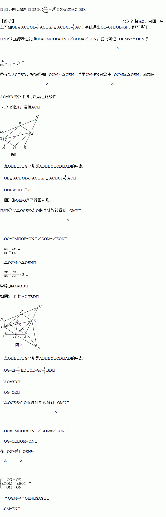 如图1所示,在四边形ABCD中,点O,E,F,G分别是AB,BC,CD,AD的中点,连接OE,EF,FG,GO,GE.