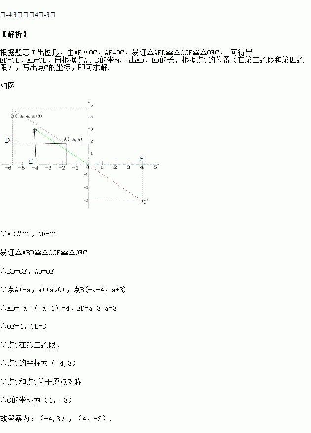 在平面直角坐标系中,O为坐标原点,点A(-a,a)(a>0),点B(-a-4,a+3),C为该直角坐标系内的一点,连结AB,OC.若AB∥OC且AB=OC,则点C的坐标为________