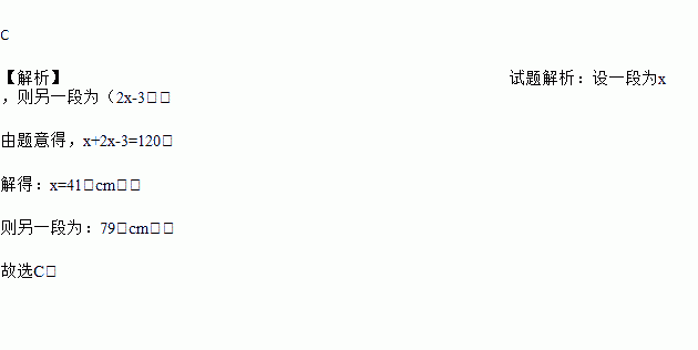 C 【解析】试题解析:设一段为x,则另一段为(2x-3), 由题意得,x+2x-3=120, 解得:x=41(cm), 则另一段为:79(cm). 故选C.