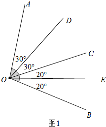 10£®Èçͼ1£¬¡ÏDOE=50¡ã£¬ODƽ·Ö¡ÏAOC=60¡ã£¬OEƽ·Ö¡ÏBOC£®£¨1£©ÓÃÖ±³ß¡¢Á¿½ÇÆ÷»³öÉäÏßOA£¬OB£¬OCµÄ׼ȷλÖã»