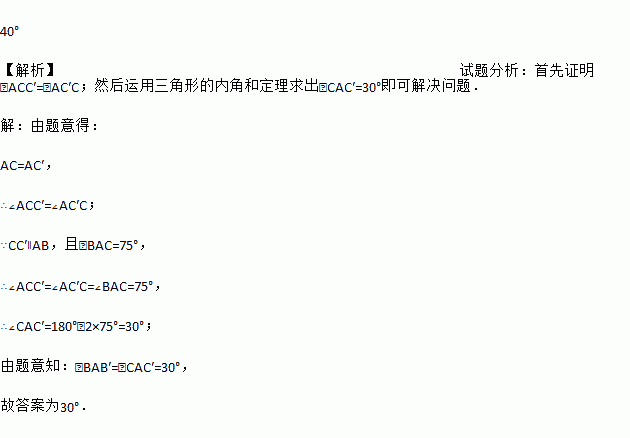如图,在△ABC中,∠CAB=75°,在同一平面内,将△ABC绕点A旋转到△AB′C′的位置,使得CC′∥AB,则∠BAB′= .
