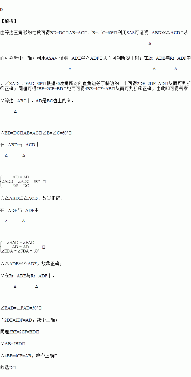 如图,在等边△ABC中,AD是BC边上的高,∠BDE=∠CDF=30°,在下列结论中:①△ABD≌△ACD;②2DE=2DF=AD;③△ADE≌△ADF;④4BE=4CF=AB.正确的个数是( )