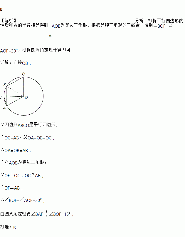 如图,点A、B、C是圆O上的三点,且四边形ABCO是平行四边形,交圆O于点F,则等于