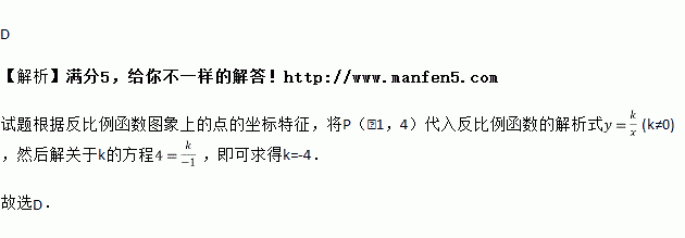 已知点P(﹣1,4)在反比例函数(k≠0)的图象上,则k的值是( )