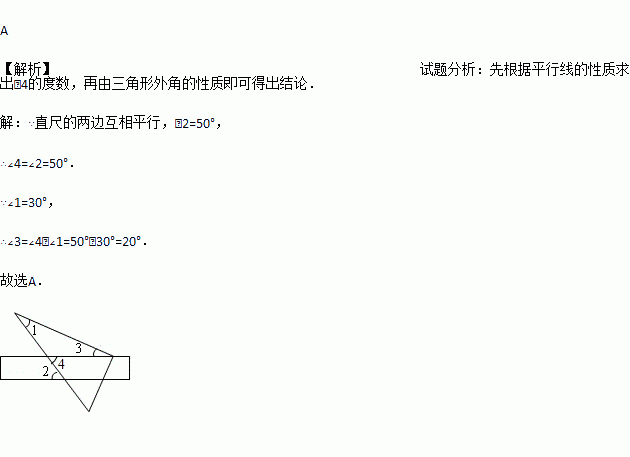 如图,将三角尺的直角顶点放在直尺的一边上,若∠1=30°,∠2=50°,则∠3的度数等于( )