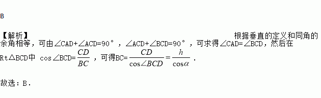 如图,电线杆CD的高度为h,两根拉线AC与BC互相垂直(A、D、B在同一条直线上),设∠CAB=α,那么拉线BC的长度为( )