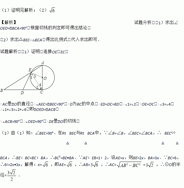 (2)若AE:EB=1:2,BC=6,求AE的长.