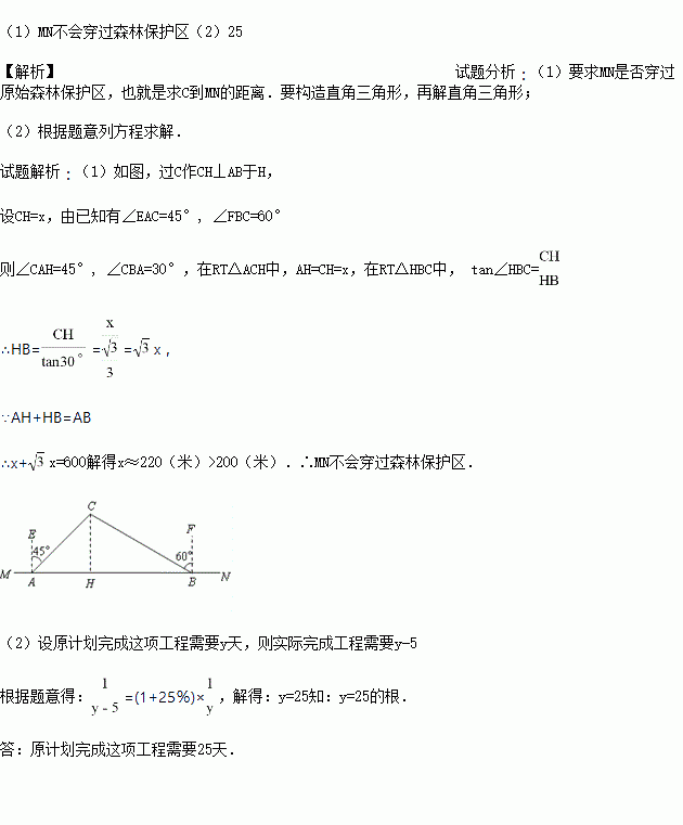 如图,要在某林场东西方向的两地之间修一条公路MN,已知C点周围200米范围内为原始森林保护区,在MN上的点A处测得C在A的北偏东45°方向上,从A向东走600米到达B处,测得C在点B的北偏西60°方向上.