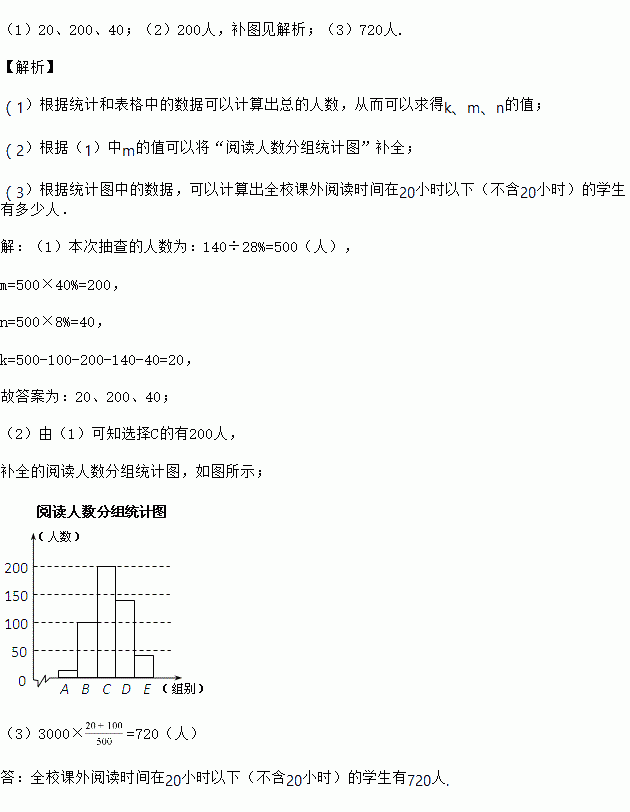 (1)阅读时间分组统计表中k、m、n的值分别是 、 、 ;