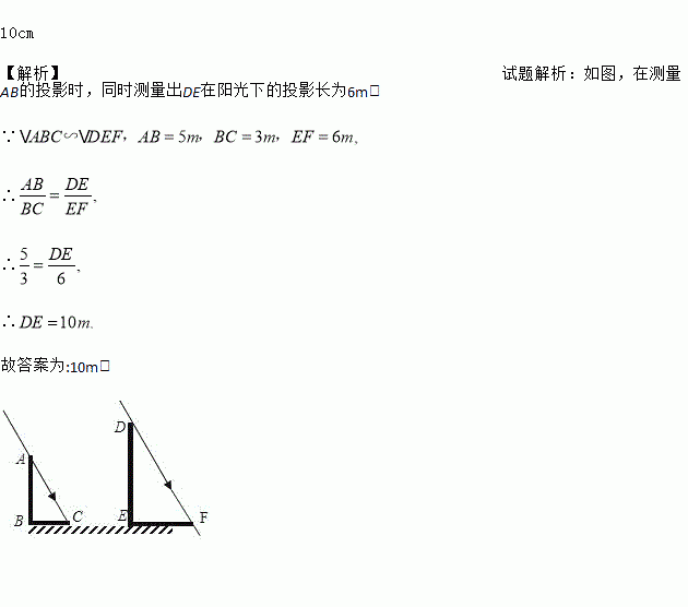 如图,AB和DE是直立在地面上的两根立柱,AB=5米,某一时刻AB在阳光下的投影BC=3米,在测量AB的投影时,同时测量出DE在阳光下的投影长为6米,则DE的长为_____.