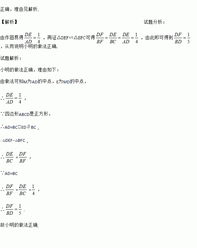 正确,理由见解析. 【解析】试题分析: 由作图易得,再证△DEF∽△BFC可得,由此即可得到,从而说明小明的做法正确. 试题解析: 小明的做法正确,理由如下: 由做法可知M为AD的中点,E为MD的中点, ∴, ∵四边形ABCD是正方形, ∴AD=BC,ED∥BC, ∴△DEF∽△BFC, ∴=, ∵AD=BC ∴==, ...