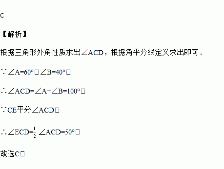 如图,∠ACD是△ABC的外角,CE平分∠ACD,若∠A=60°,∠B=40°,则∠ECD等于( )