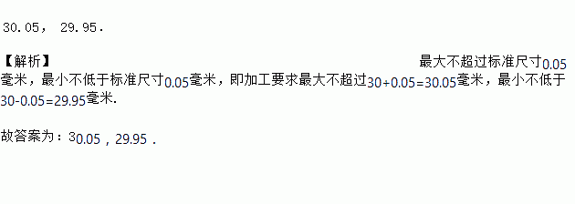 30.05, 29.95. 【解析】最大不超过标准尺寸0.05毫米,最小不低于标准尺寸0.05毫米,即加工要求最大不超过30+0.05=30.05毫米,最小不低于30-0.05=29.95毫米. 故答案为:30.05,29.95.