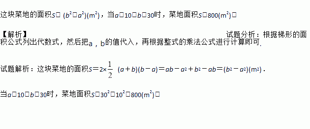 李大伯把一块L型的菜地按如图所示的虚线分成面积相等的两个梯形,这两个梯形的上底都是am,下底都是bm,高都是(b-a)m,请你算一算这块菜地的面积是多少,并求出当a=10,b=30时这块菜地的面积.