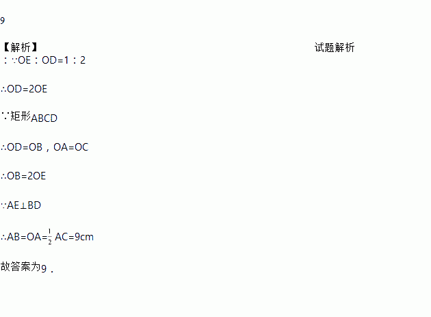 如图,在矩形ABCD中,O是对角线的交点,AE⊥BD于E,若OE:OD=1:2,AC=18cm,则AB=________cm.
