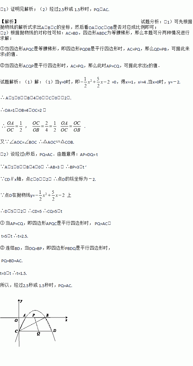 (2)过点C作CD∥x轴交抛物线于点D.若点P在线段AB上以每秒1个单位的速度由A向B运动,同时点Q在线段CD上也以每秒1个单位的速度由D向C运动,则经过几秒后,PQ=AC.