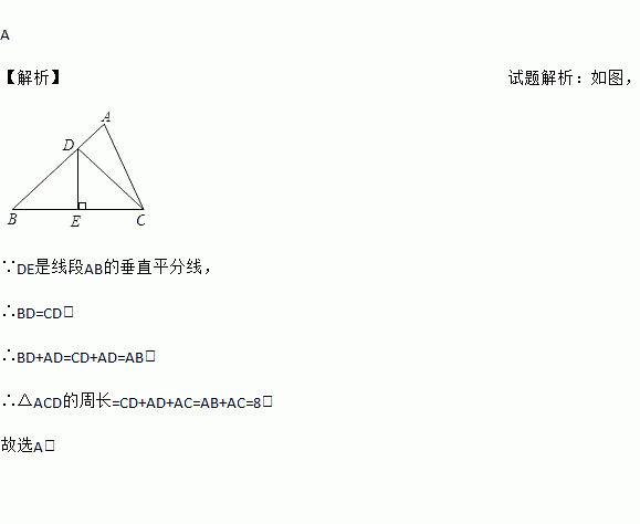 A 【解析】试题解析:如图, ∵DE是线段AB的垂直平分线, ∴BD=CD, ∴BD+AD=CD+AD=AB, ∴△ACD的周长=CD+AD+AC=AB+AC=8, 故选A.