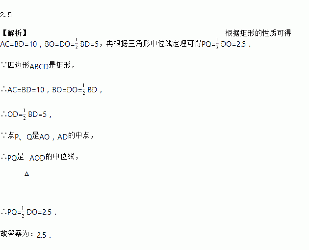 如图,矩形ABCD的对角线AC与BD相交点O,AC=10,P、Q分别为AO、AD的中点,则PQ的的长度为________.