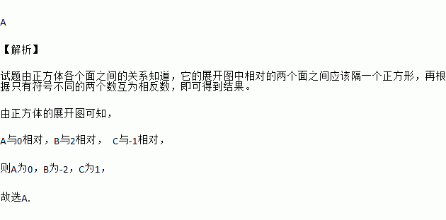 如图是一个正方体包装盒的表面积展开图,若在其中的三个正方形A、B、C内分别填上适当的数,使得将这个表面展开图沿虚线折成正方体后,相对面上的两数互为相反数,则填在A、B、C内的三个数依次为( )