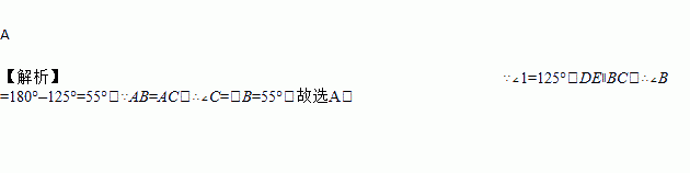 A 【解析】∵∠1=125°,DE∥BC,∴∠B=180°–125°=55°,∵AB=AC,∴∠C=∠B=55°,故选A.