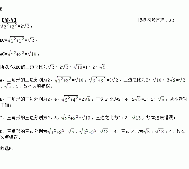 下列4×4的正方形网格中,小正方形的边长均为1,三角形的顶点都在格点上,则与△ABC相似的三角形所在的网格图形是( )