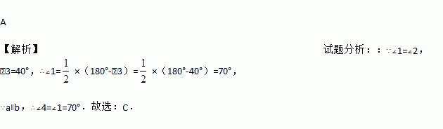 A 【解析】试题分析::∵∠1=∠2,∠3=40°,∴∠1=×(180°-∠3)=×(180°-40°)=70°, ∵a∥b,∴∠4=∠1=70°.故选:C.