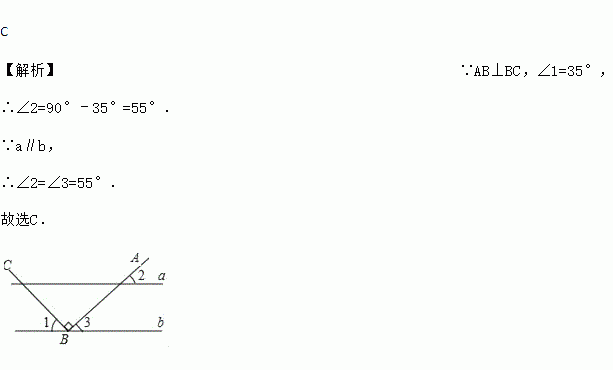 如图,a∥b,点B在直线a上,且AB⊥BC,∠1=35°,那么∠2=( )