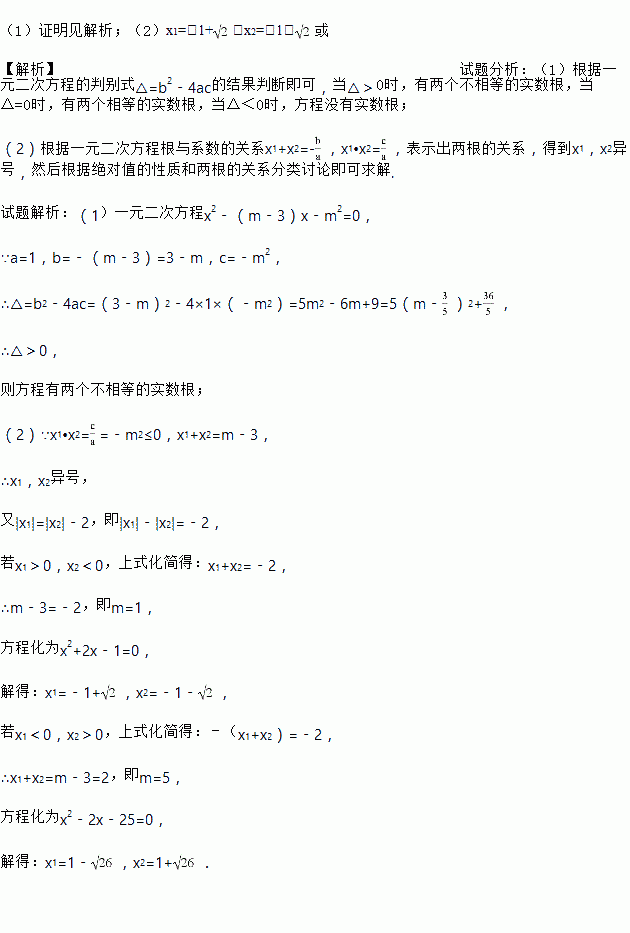 (1)证明见解析;(2)x1=﹣1+,x2=﹣1﹣或 【解析】试题分析:(1)根据一元二次方程的判别式△=b2﹣4ac的结果判断即可,当△>0时,有两个不相等的实数根,当△=0时,有两个相等的实数根,当△<0时,方程没有实数根; (2)根据一元二次方程根与系数的关系x1+x2=-,x1•x2=,表示出两根的关系,得到x1,x2异号,然后根据绝对值的性质和两根的关系分类讨论即可求解. ...